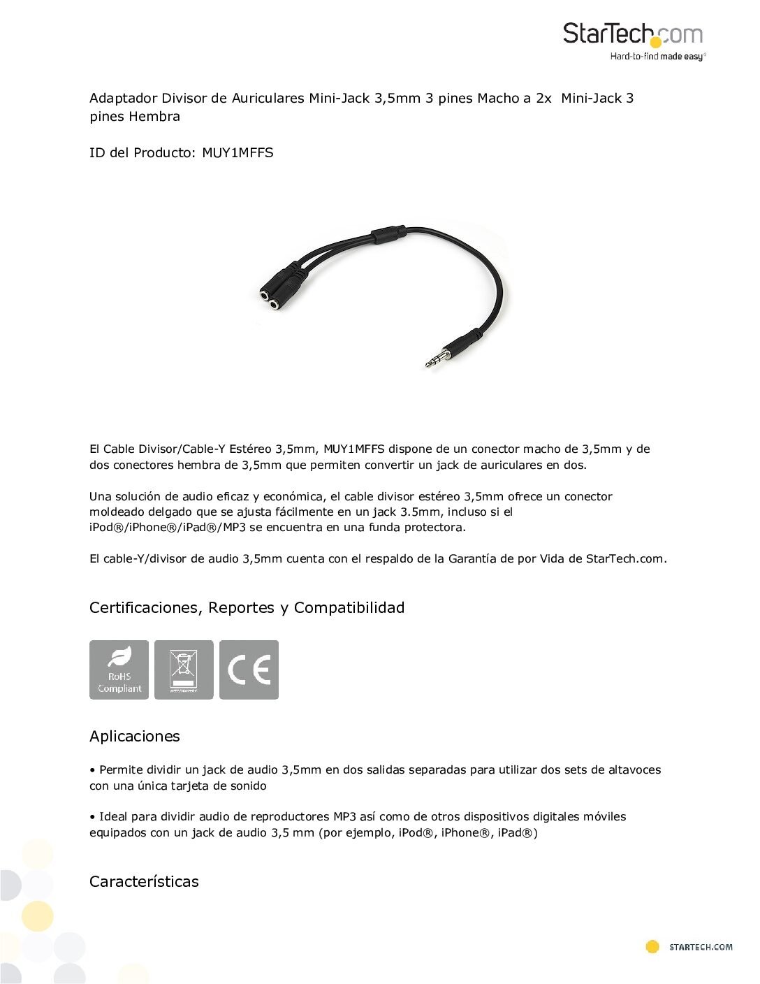 Adaptador estéreo en Y 3.5 mm StarTech. Conector macho a 2 hembras. Splitter compacto, duradero y perfecto para compartir audio sin perder calidad.