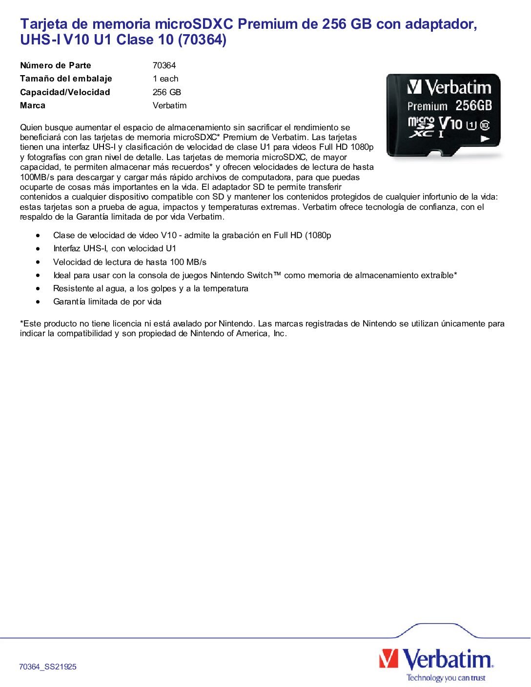 microSDXC 256GB Clase 10 V10 con adaptador. Almacenamiento rápido para celulares, cámaras, drones o consolas. Graba video HD y transfiere sin demoras.
